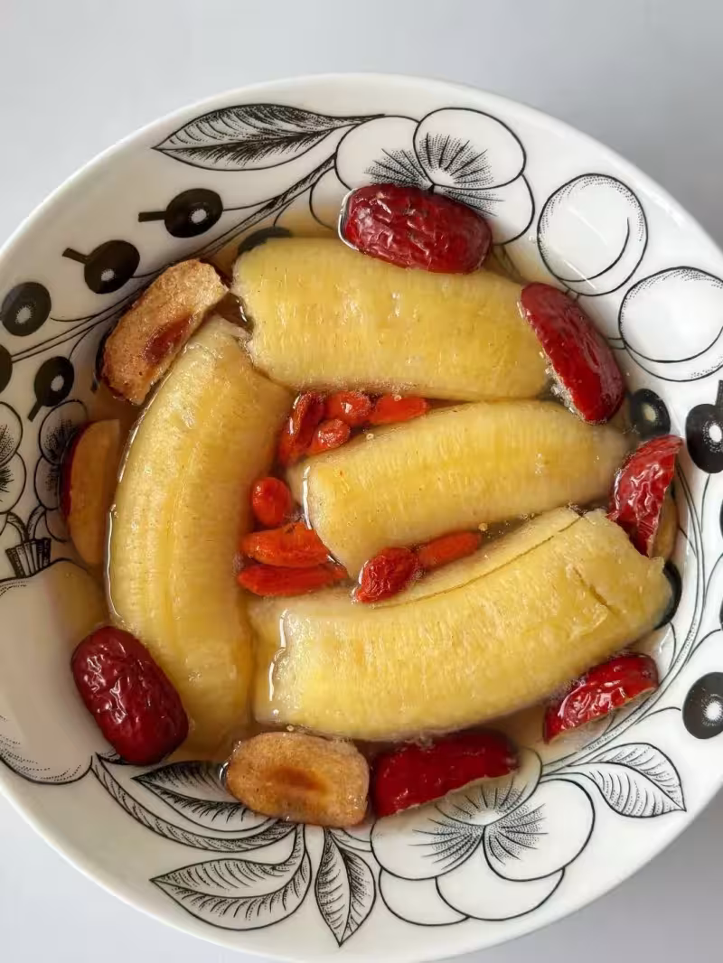 桃香蕉兩根,熟紅棗幾顆去核切片,一點白冰糖,少許枸杞,加適量水,放在碗里,上鍋蒸20分鐘就行。