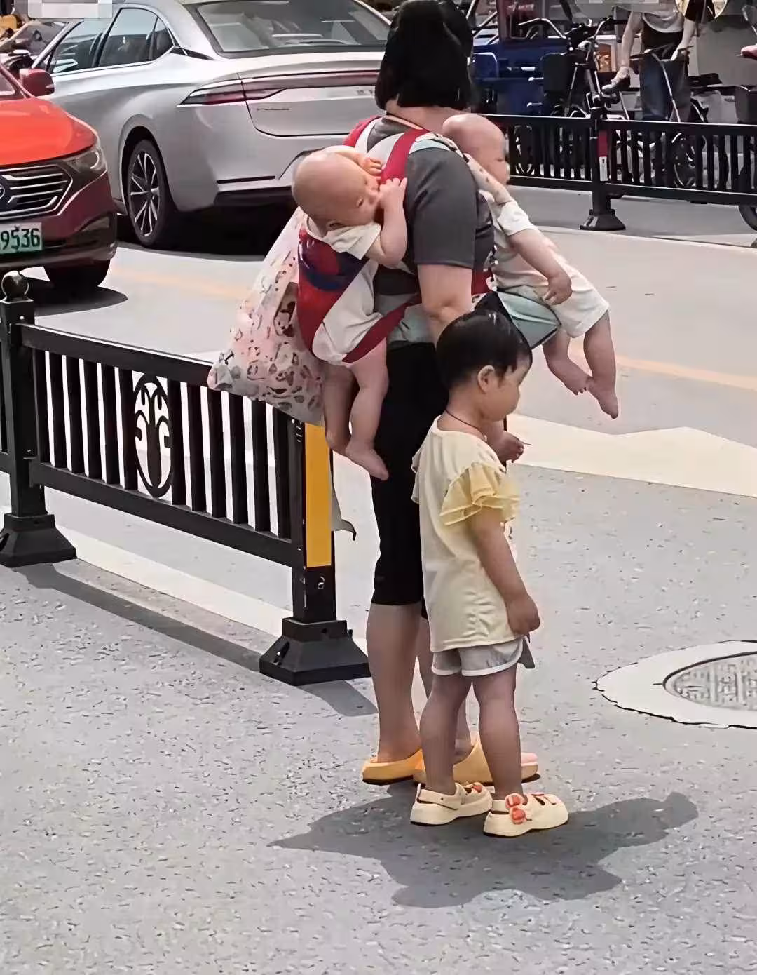路上遇到一位媽媽帶3娃!!右手牽+肩上扛+懷裡抱…眼尖網友發現「關鍵細節...」怒轟:不如不生