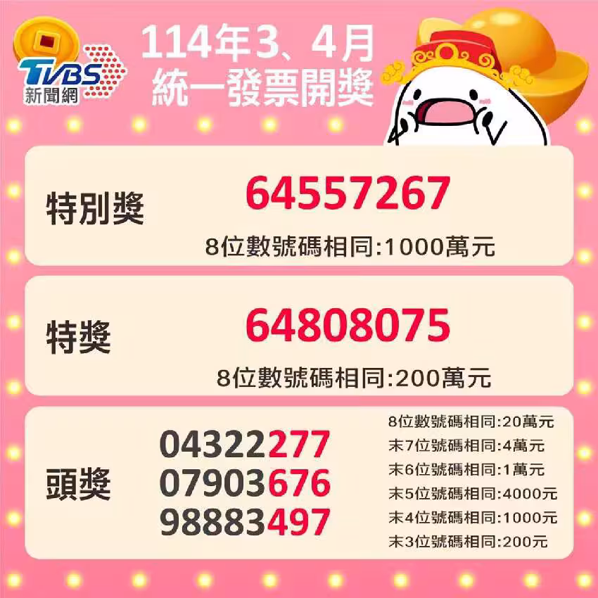 114年3、4月期統一發票號碼曝光,千萬特別獎號「64557267」,開出15張;200萬特獎「64808075」,開出19張,快提出發票兌獎!