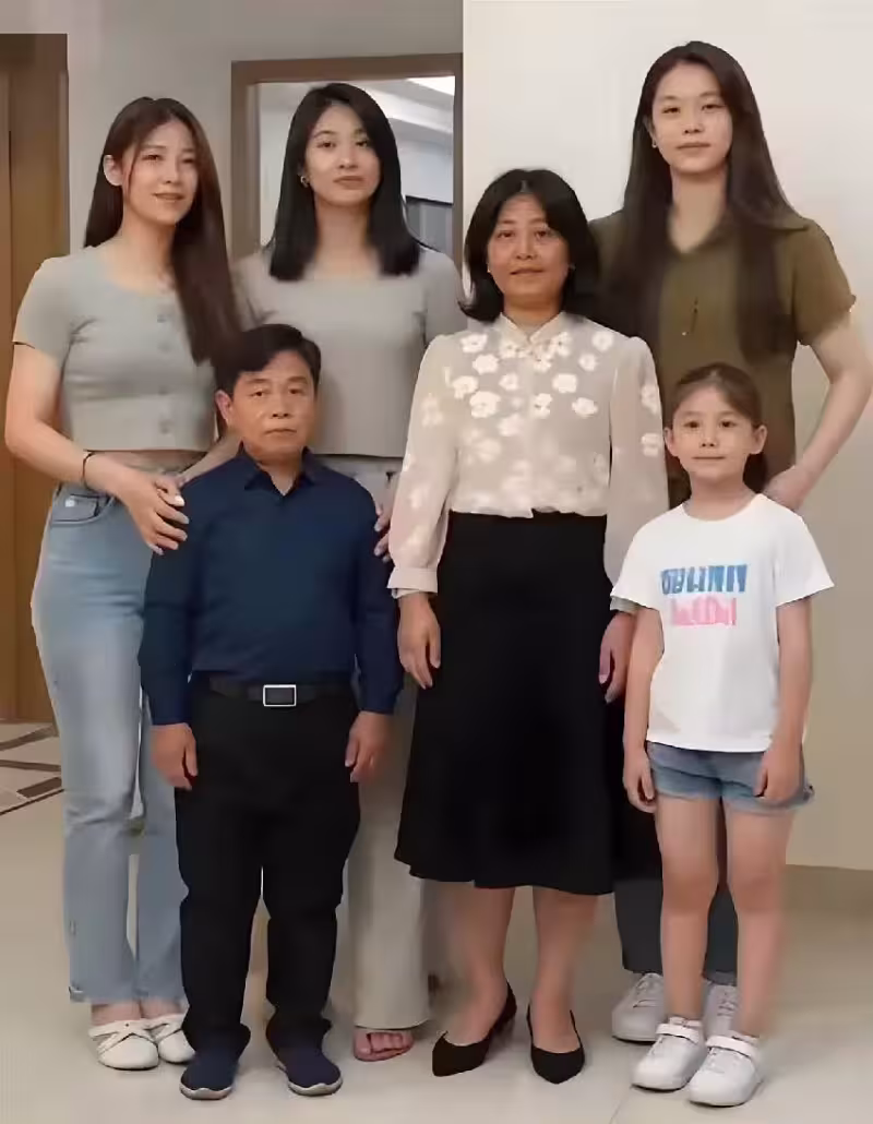 然而,緊挨著他們的三個女兒,卻個個亭亭玉立,身高都在1米7以上,擁有著令人羨慕的模特般的身材比例。