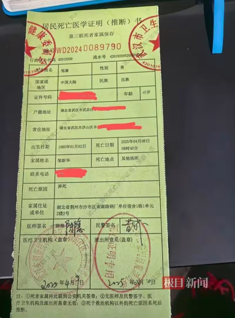 鄒新華和胡瑞瓊夫婦雙眼凹陷、眼圈發黑,看著兒子的遺照喃喃自語,剛接到噩耗時,誤以為是詐騙!「叮鈴鈴……」4月8日下午3時許,鄒新華的手機突然響起,他以為是詐騙或推銷,便沒有接聽,然而,同樣的號碼依然在撥打,意識到情況不對的鄒新華接聽了,對方是武漢市東湖新技術開發區一家派出所的警察,鄒康在光谷高新大道一家酒店已經失去生命跡象。