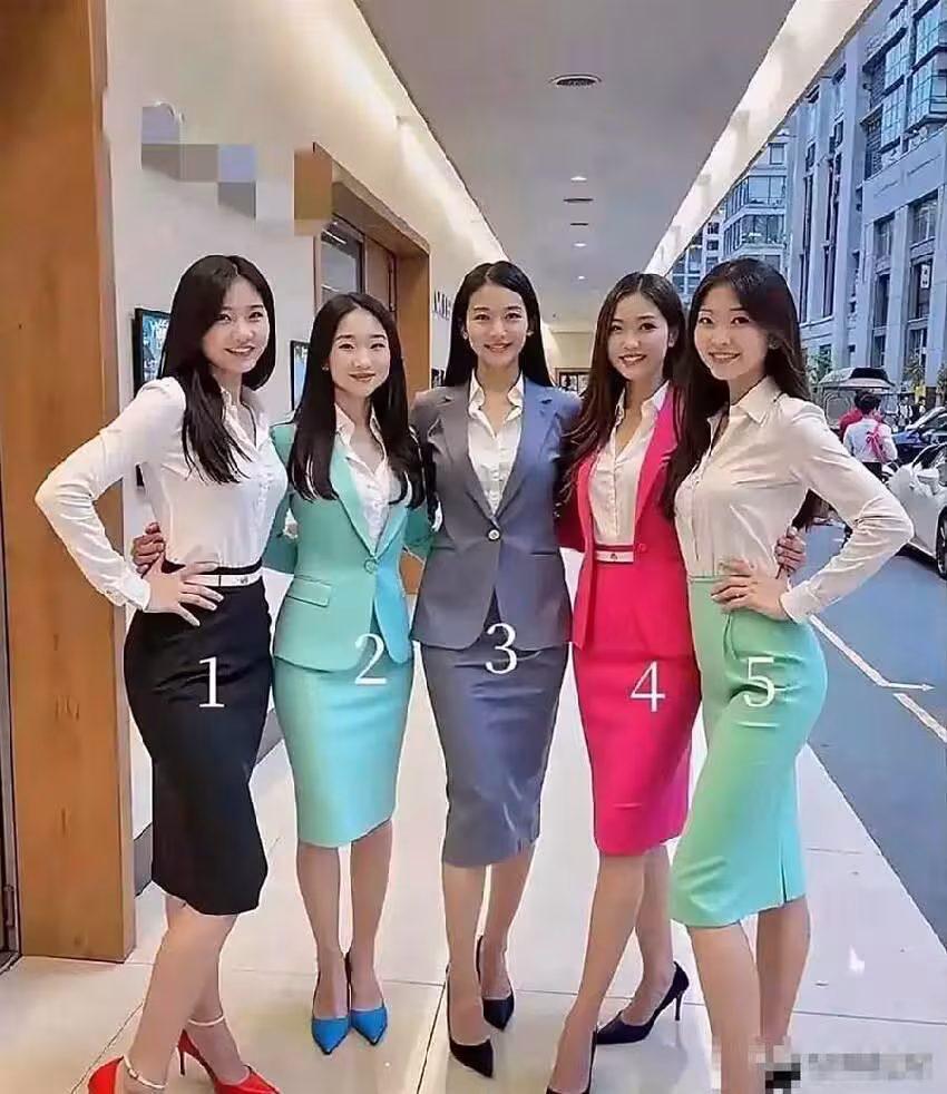 照片中,五位女士穿著色彩鮮艷的職業裝,