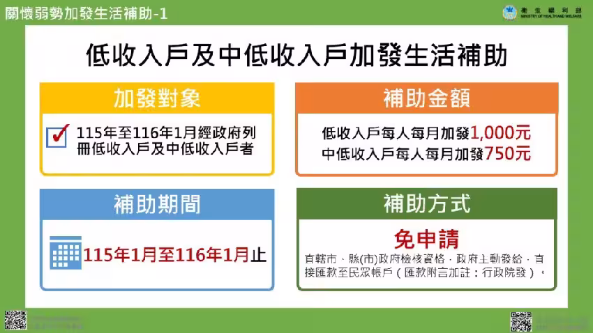 衛福部對此表示,為因應國際情勢變化並及時照顧經濟弱勢族群,將推動3大弱勢照顧措施,除了原有的補助外,自115年1月起至116年1月止,會按月加發生活補助金,預計有109萬人能受惠。