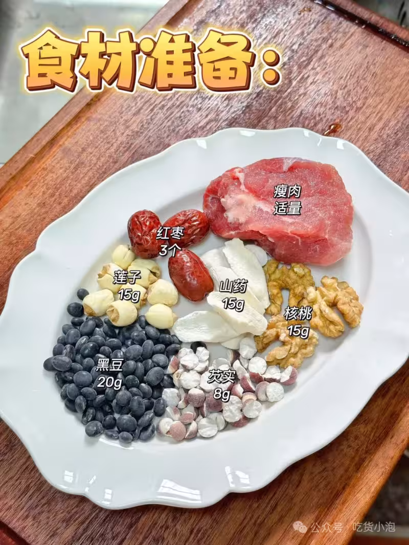 蓮子15g、核桃仁15g、黑豆20g、紅棗3個、山藥15g、芡實8g、瘦肉適量