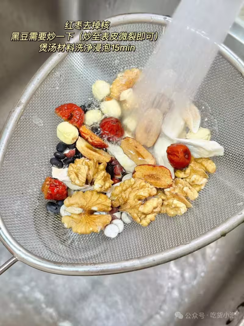 瘦肉冷水下鍋焯水後洗凈,紅棗去核,黑豆炒至微裂,其他煲湯材料洗凈後一併放入燉盅,加入適量清水,隔水燉2小時,出鍋前加適量鹽調味即可✅