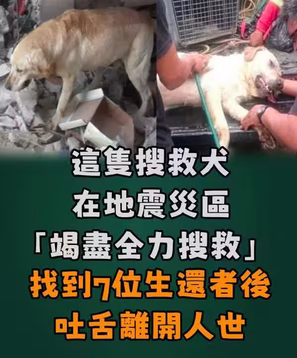 這隻搜救犬在地震災區「歇盡全力搜救」救出7位生還者後,吐舌離開人世.