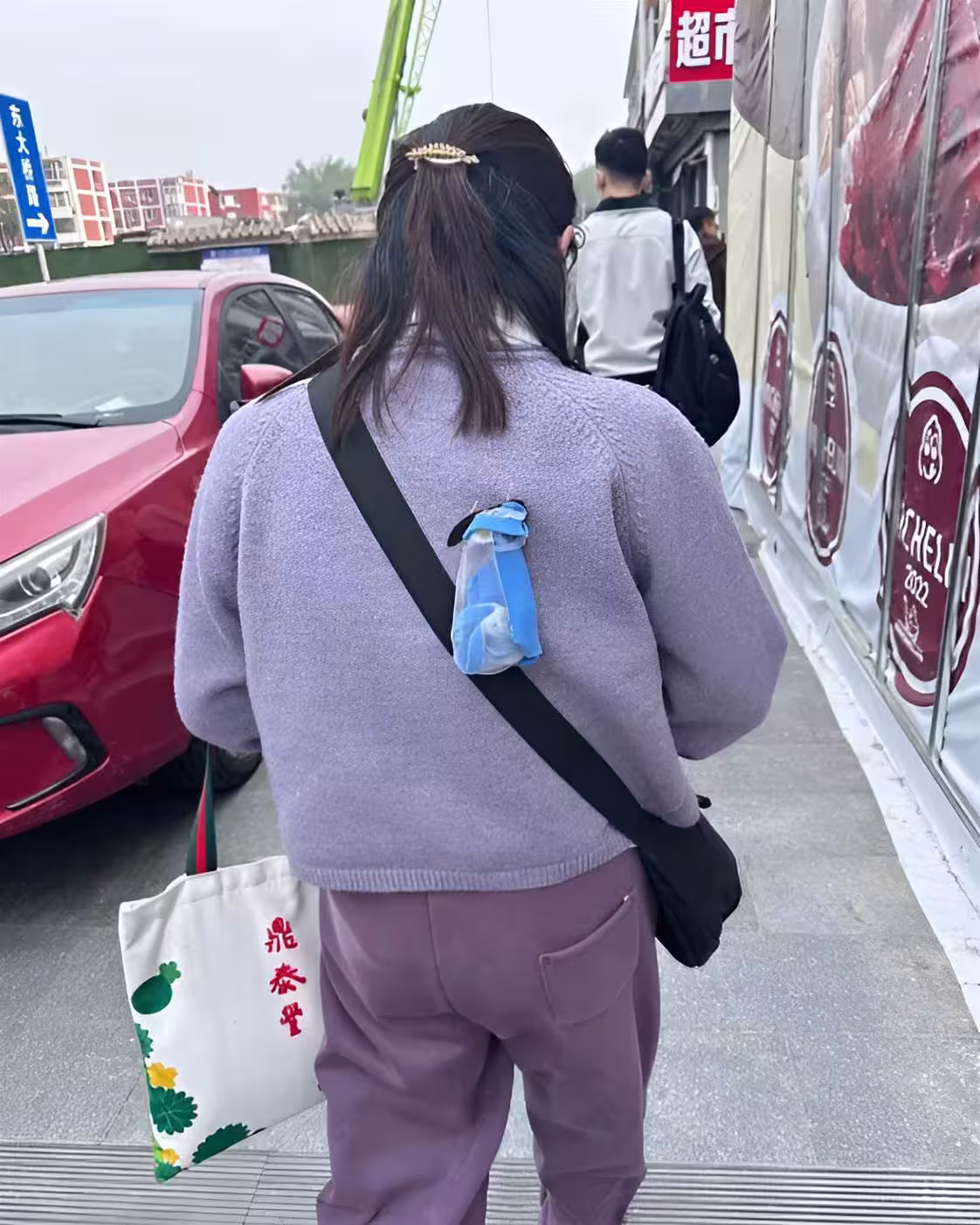 事情發生在一條繁忙的街道上。一位穿著紫色毛衣的女子正匆匆前行,肩上斜挎著一個黑色的包。然而,包上掛著的一個透明塑料袋卻格外引人注目。袋子裡裝著一件藍色的物品,遠遠看去,讓人不禁浮想聯翩。