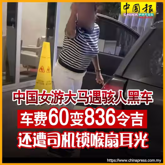 (吉隆坡18日訊)中國女遊客來馬旅遊時疑碰上黑心司機,聲稱不僅被勒索逾14倍車費、被限制人身自由,甚至遭扇巴掌和勒喉威脅,令她一度深感生命受威脅!
