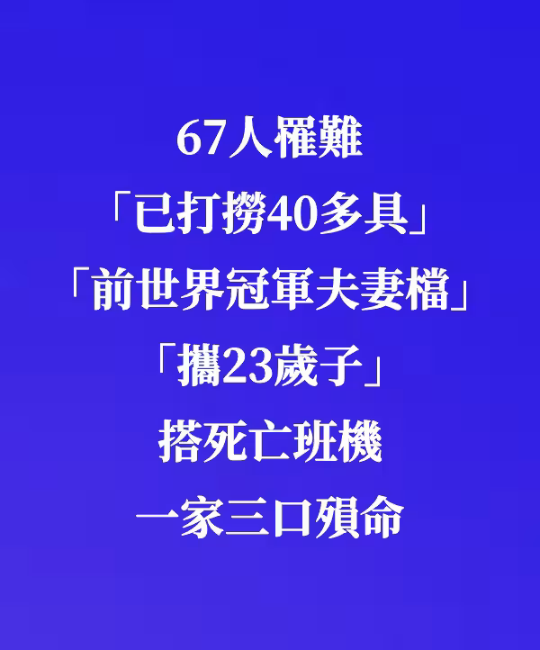 67人罹難「已打撈40多具」!「前世界冠軍夫妻檔」攜23歲子搭死亡班機 一家三口殞命!