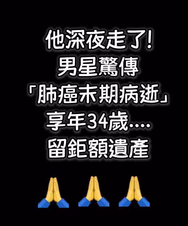他深夜走了!男星驚傳「肺癌末期病逝」享年34歲....留鉅額遺產。