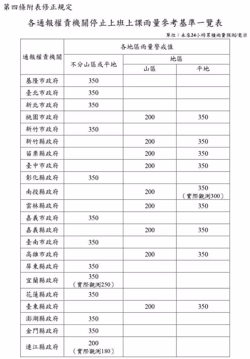 屏東縣:枋山鄉、車城鄉、恆春鎮、獅子鄉、牡丹鄉、滿州鄉等6鄉鎮停班停課,其餘正常上班正常上課。