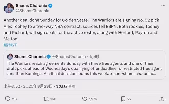 9月29日,勇士終於有動作了:1、多年合同簽約霍福德;2、小佩頓和梅爾頓承諾加盟勇士,他倆都是一年底薪合同;3、四年合同簽下56號秀威爾-理察,其中前兩年保障;4、雙向合同簽約52號秀圖希。一天之內補強五人!