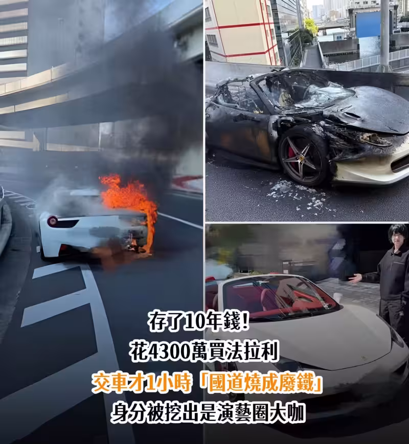 存了10年錢!花4300萬買法拉利,交車才1小時,「國道燒成廢鐵」身份被挖出「是演藝圈大咖」