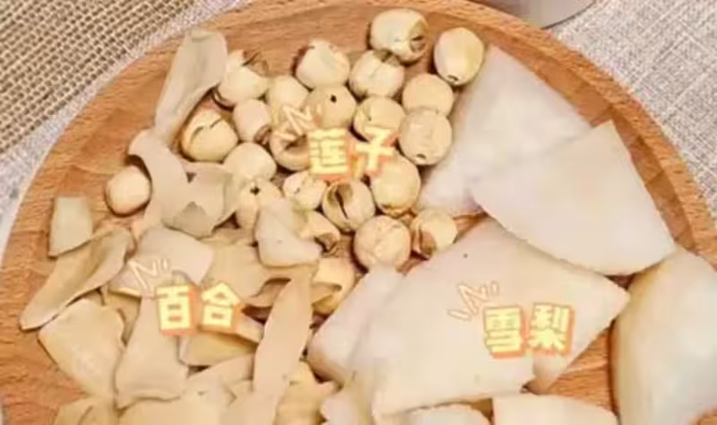 食材:雪梨1個、蓮子10克、百合10克、銀耳1小朵、冰糖5克。