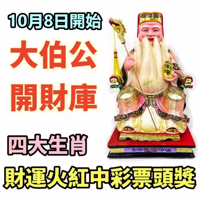 10月8日開始大伯公開財庫,四大生肖財運火紅中彩票頭獎!