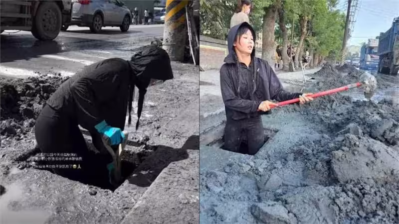 身材嬌小的籃籃不怕髒累,鑽進深達她腰部的水溝奮力清淤。