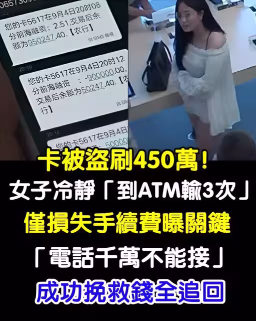 卡被盜刷450萬!女子冷靜「跑ATM輸3次」只損失手續費,她曝關鍵「電話千萬不能接」成功挽救全追回