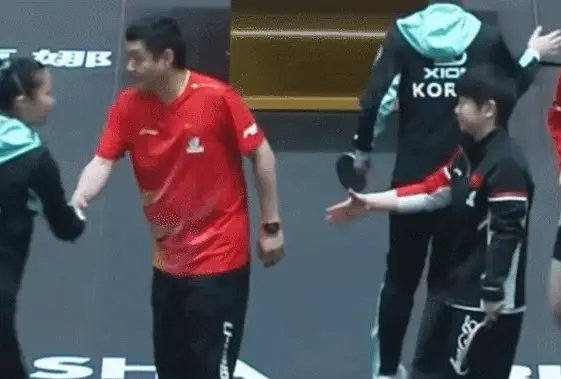 比賽結束後兩隊握手致意,我們能看到申裕斌一直面帶笑容,而且跟莎莎握手時她還故意摸了一下莎莎的肚子,兩位小姑娘的感覺是非常之好的,場上是對手場下就可以是朋友。