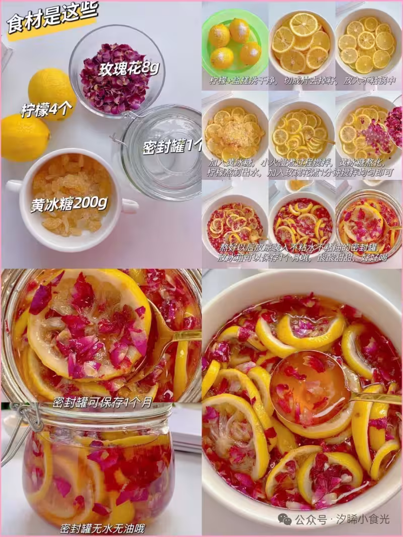 食材:檸檬4個、玫瑰花8g、黃冰糖200g、密封罐1個 製作步驟: