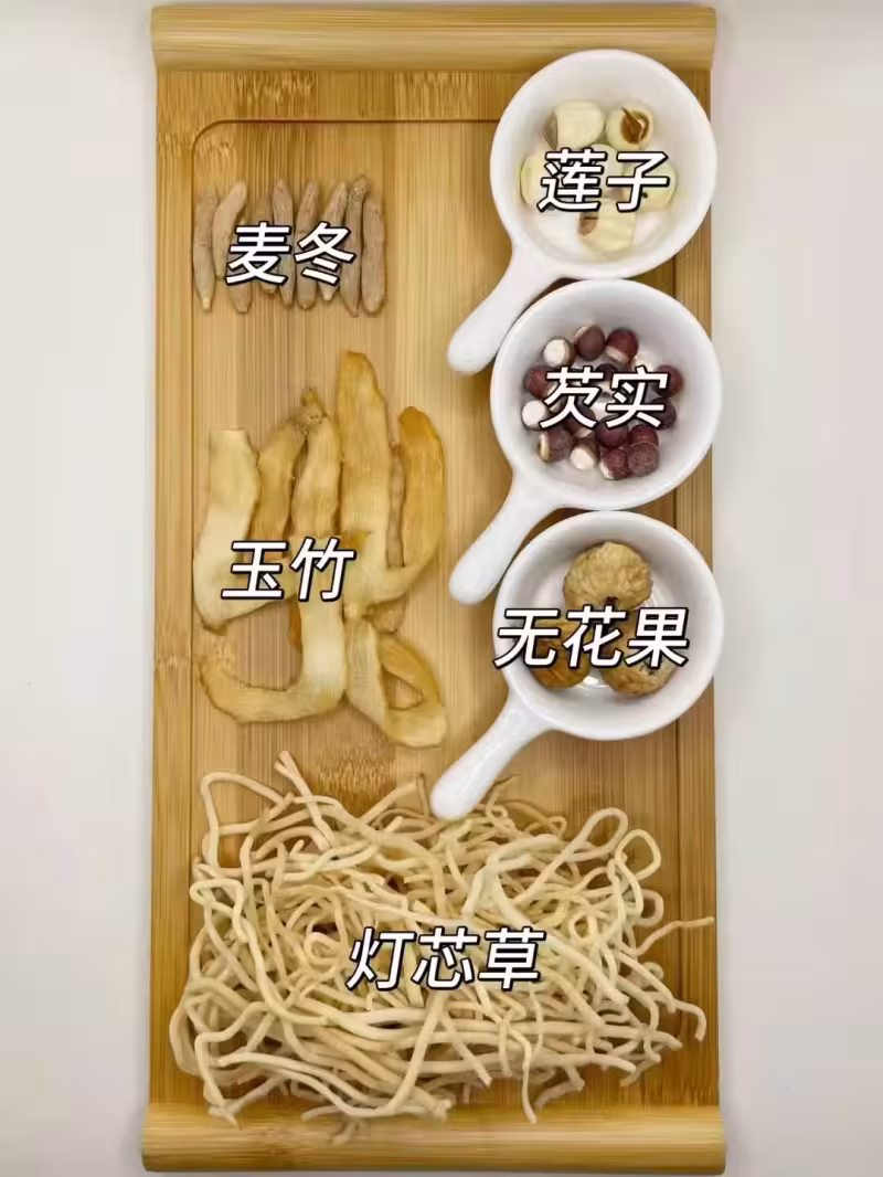 食材:蓮子、麥冬、芡實、玉竹、無花果、燈芯草。