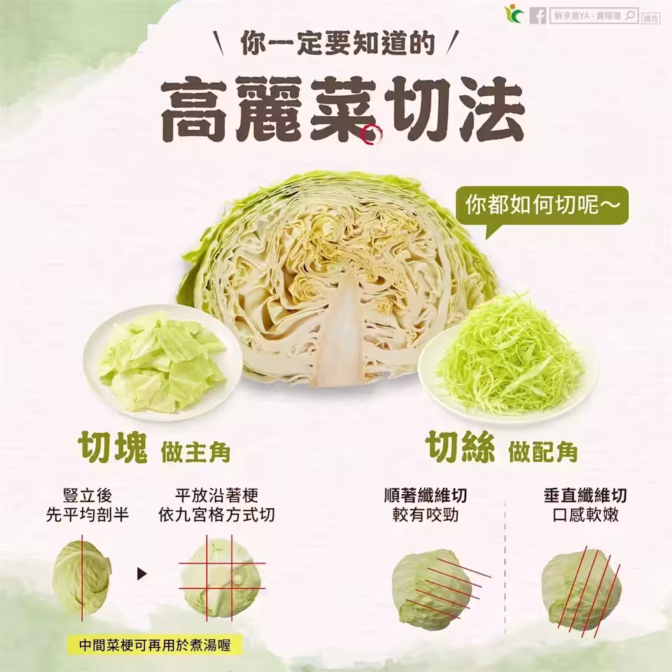 高麗菜含有維生素C、鈣、磷、鉀等營養素,不僅好吃又營養。近日農糧署表示,高麗菜切法不同竟然會影響口感,順著葉脈纖維切或垂直切差很大,可視搭配食材及個人偏好,選擇不同的切法。