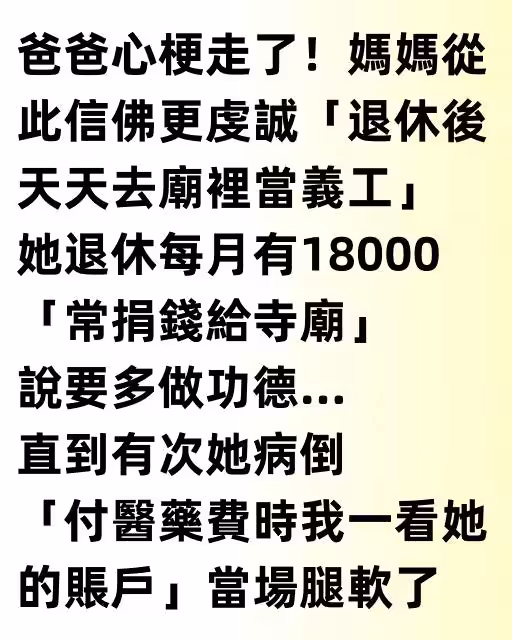 爸爸心梗走了!媽媽從此信佛更虔誠「退休後天天去廟裡當義工」,她退休每月有18000「常捐錢給寺廟」說要多做功德… 直到有次她病倒「付醫藥費時我一看她的帳戶」當場腿軟了