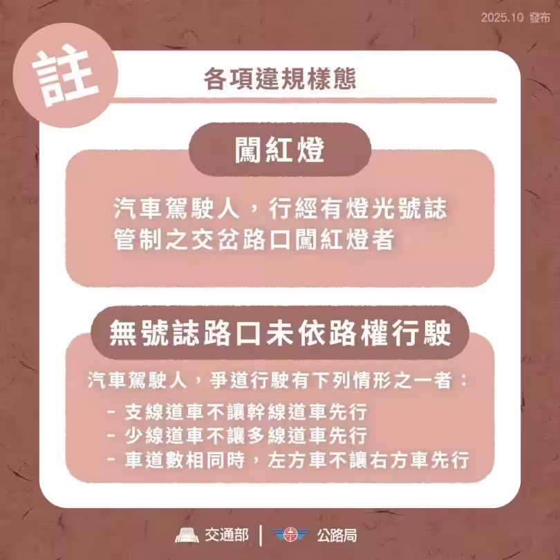 交通部表示,此次新增的違規行為包括「闖紅燈」、「無號誌路口未依路權行駛」以及「行近特定路段未依規減速」。其中,闖紅燈指駕駛人行經有號誌管制路口未依燈號停車;未依路權行駛則涵蓋支線道車不讓幹線道車、少線道車不讓多線道車或左方車不讓右方車等情形。