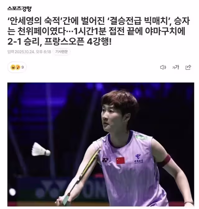 文中寫道:陳雨菲無愧是安洗瑩宿敵,今年安洗瑩只有4次敗績陳雨菲創造2次,山口茜1次,韓悅1次,陳雨菲在半決賽會再度遇上安洗瑩。