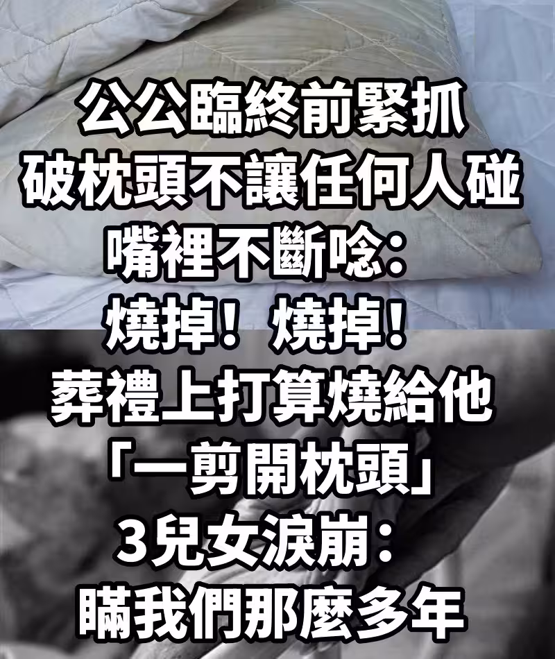 公公臨終前「緊抓破枕頭不讓任何人碰」嘴裡不斷念:燒掉!燒掉! 葬禮上打算燒給他「一剪開枕頭」3兒女淚崩:瞞我們那麼多年