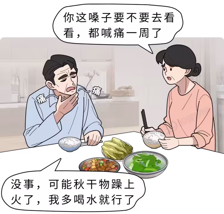 隨後一段時間,他總感覺嗓子火辣辣地疼,吞咽飯菜像咽玻璃碴。妻子勸他去醫院,但他總是敷衍。