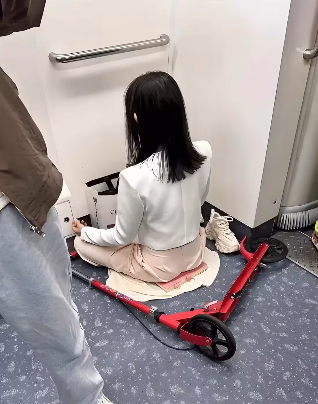 有人偷笑,有人覺得不雅,更多人是跟我一樣,滿腦子問號。我忍不住拿出手機拍了下來,PO到我常逛的一個本地論壇,還附上一句調侃:「現在座位這麼搶手嗎?自己開發『地板位』了?這位小姐姐是什麼操作?」