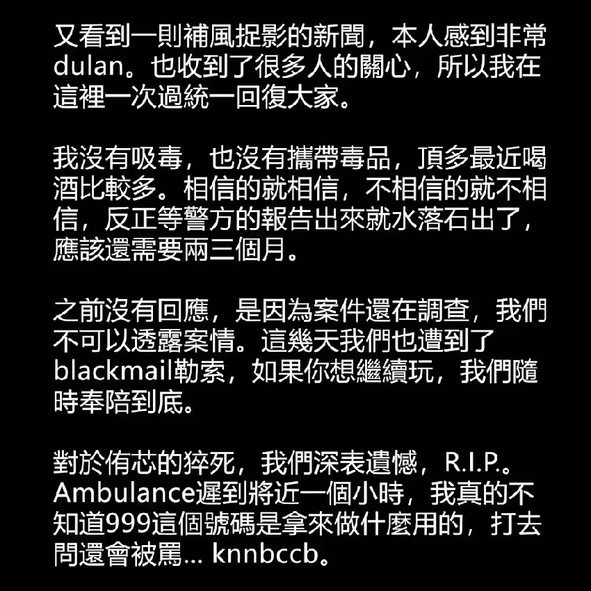 對於侑芯的猝死,我們深表遺憾,R.I.P。」並透露救護車遲到將近一個小時,「我真的不知道999這個號碼是拿來做什麼用的,打去問還會被罵。」表達對此事件的遺憾及憤慨。