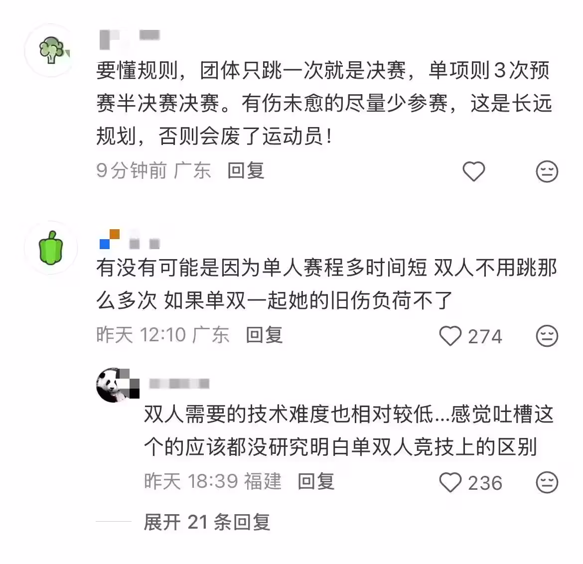 總結來看,儘管全紅嬋未能參加單人跳台比賽,但她在其他項目中的成功,已經證明了她的實力。她的決策也體現了她在職業生涯中對自己身體和未來的深思熟慮。希望全紅嬋繼續保持拼搏精神,不斷超越自我,在未來的賽事中取得更多輝煌成就!