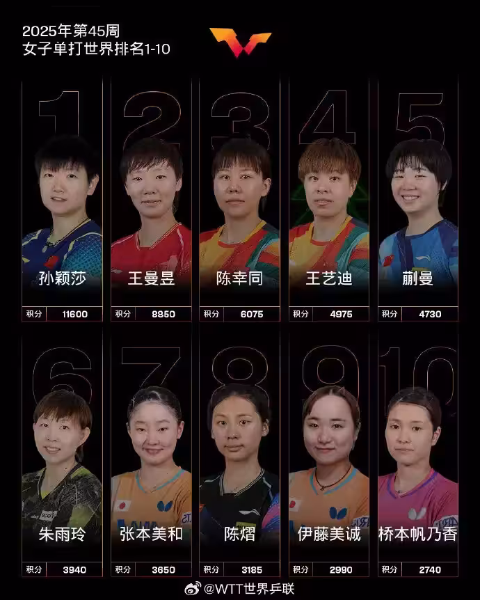 值得一提對手,WTT蒙彼利埃冠軍賽女單冠軍王藝迪的世界排名,上升1個位次次來到第4;而獲得女單亞軍的德國選手沙賓-溫特,其世界排名上升10個位次來到第16。溫特的這個排名,同時創新個人職業生涯排名新高。