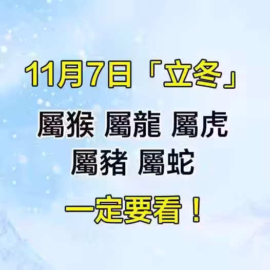 11月7日「立冬」「屬猴 屬龍 屬虎 屬豬 屬蛇」一定要看!