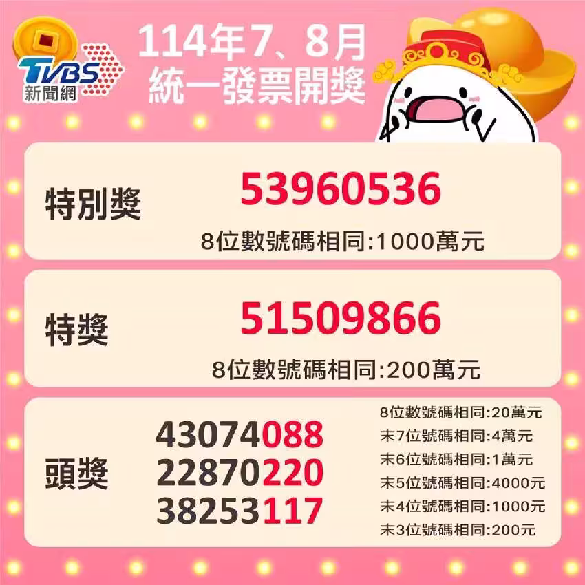 財政部日前公布民國114年7、8月期統一發票中獎清冊,17人中1000萬特別獎,17位幸運兒抱走200萬特獎。