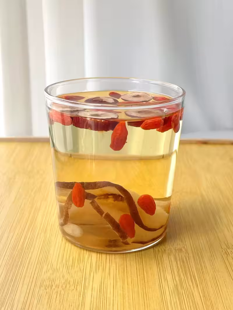 雪梨4片,桂圓5顆,黃芪5g,麥冬5顆。紅棗5顆,枸杞8顆