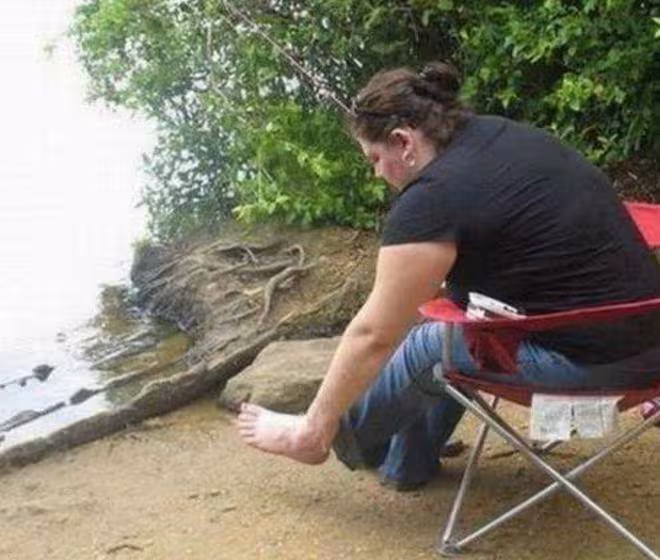 從照片里的角度看去,坐在河邊的婦女想是一位變異人似的。
