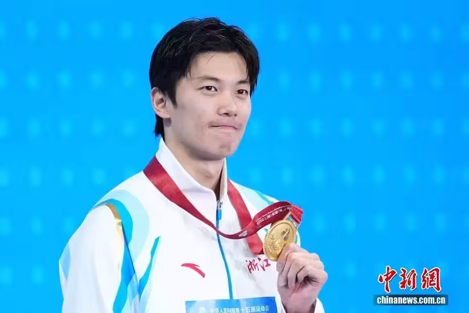 11月14日,在深圳大運中心游泳館舉行的第十五屆全國運動會男子200米個人混合泳決賽中,浙江隊汪順以1分56秒20獲得冠軍。圖為汪順展示金牌。