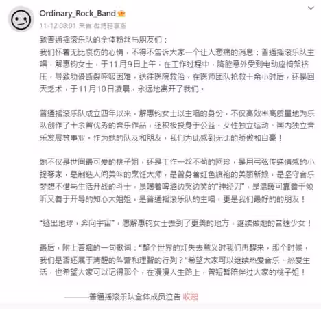 團員們引用樂團歌曲中的詞句,期盼解惠鈞已前往更美好的地方,並希望歌迷能繼續熱愛音樂與生活,記得這位曾陪伴大家的「桃子姐」、「音速少女」。