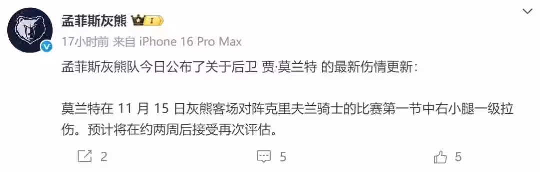 灰熊官方宣布:莫蘭特遭遇右小腿一級拉傷,將在兩周之後接受重新評估。小腿拉傷分為幾個等級:一級拉傷通常需要1-2周,二級拉傷則需要4-6周,三級拉傷則需要8-12周。從這個角度來看,莫蘭特缺陣時間在正常的範圍。