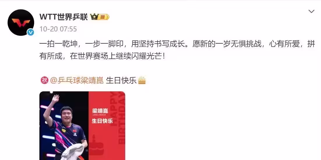 WTT世界乒聯送給他的生日祝福是「凡一拍皆有天地,步一履都留下足跡」。