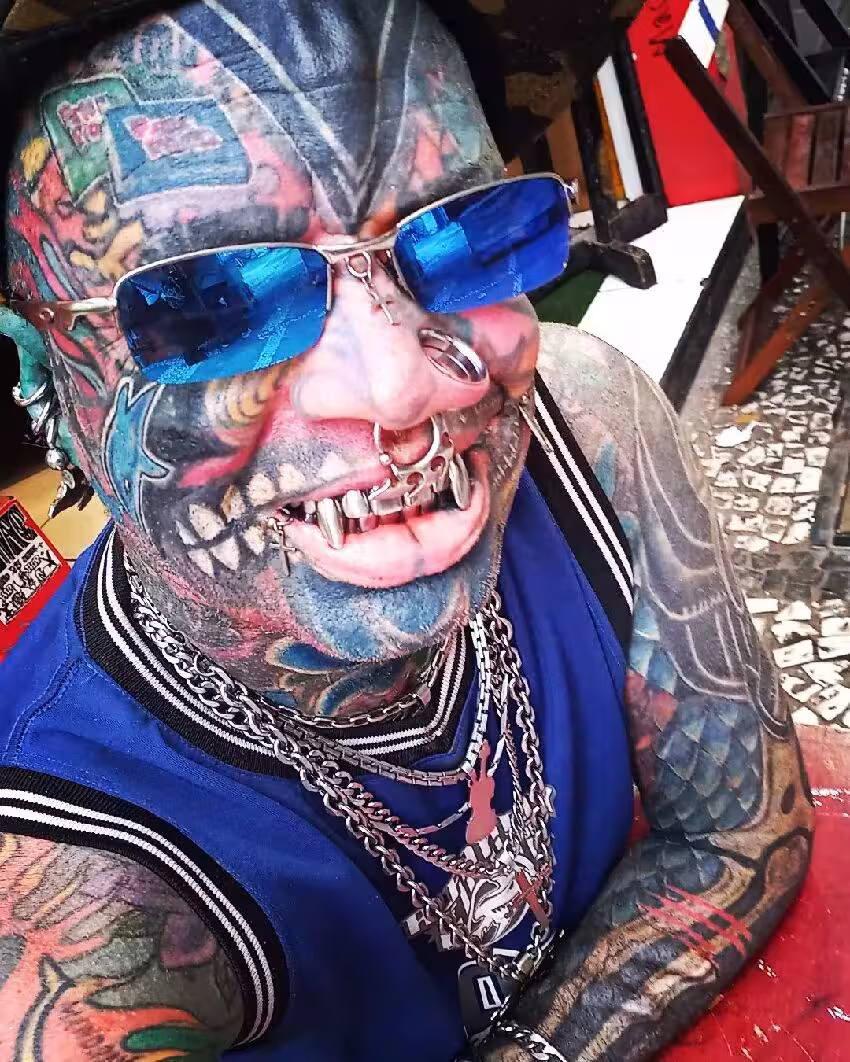 除了身上以外,他連眼球和牙齦都不放過,不僅整個眼白都變成藍色,甚至連牙齒都改造成大尖銀牙,鼻子上也穿了大鼻環,每天出門都會引起路人的關注和討論,這也讓他成為了知名網紅,許多媒體都爭相採訪他。