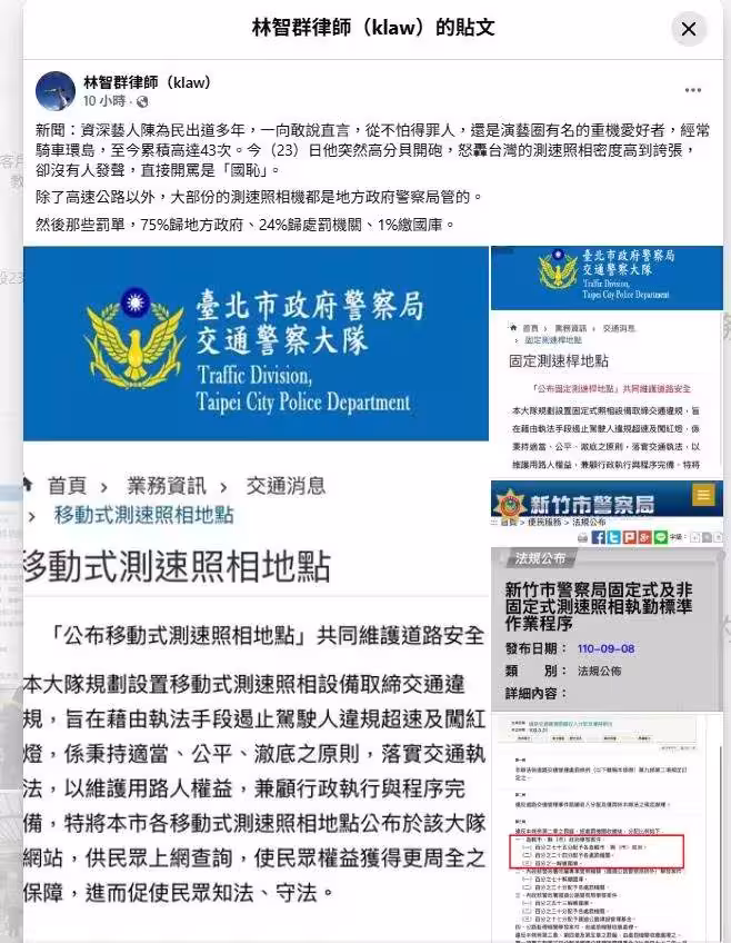 律師林智群也發文補充說明,大多數測速照相機由地方警察局管理。
