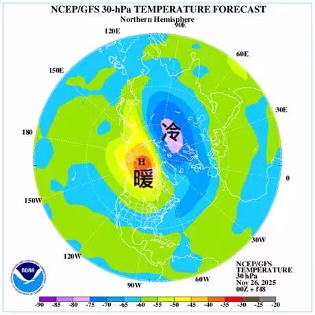 鄭明典詳細說明,目前在北極圈上方大約23公里的高空位置,有兩團溫度差異明顯的氣團正處於對峙狀態。
