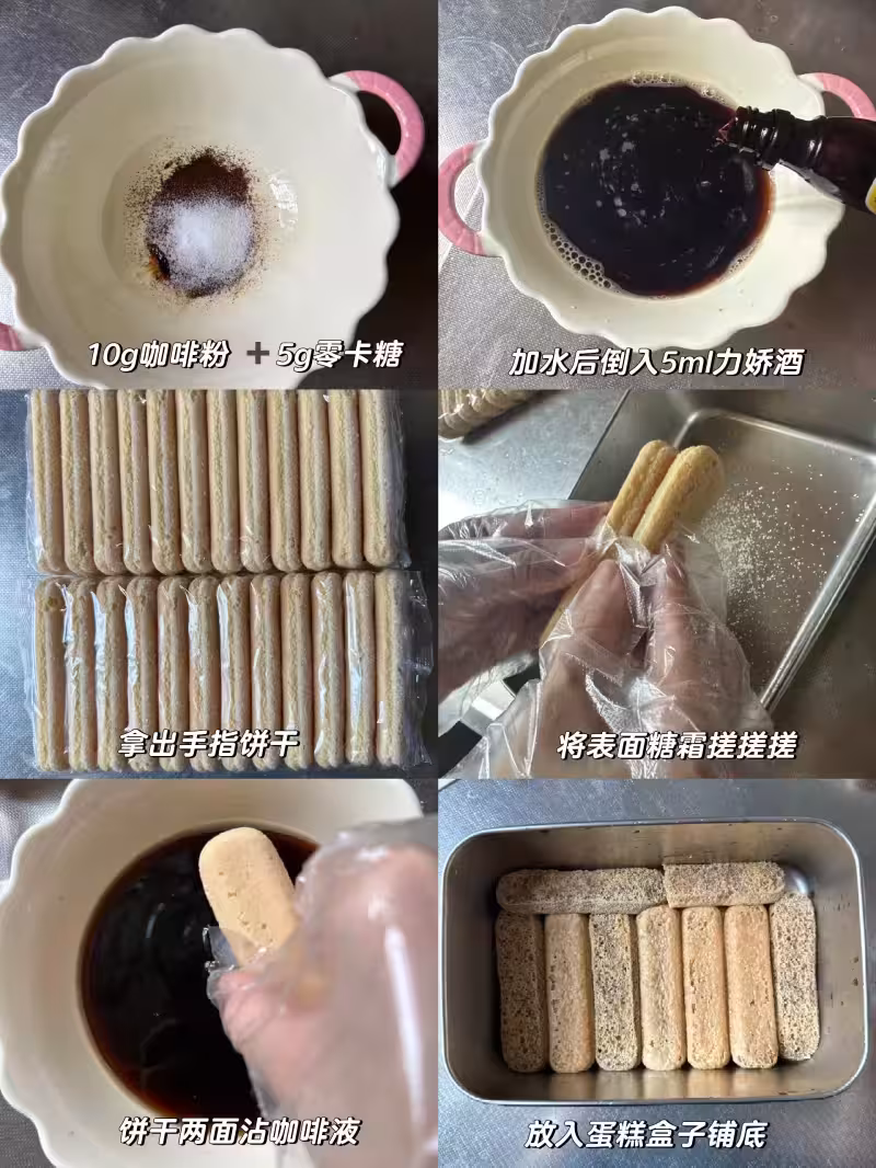 6️⃣手指餅乾兩面沾咖啡液鋪滿蛋糕盒子,倒上一層奶酪糊,然後重複這一步,將奶油奶酪糊抹平