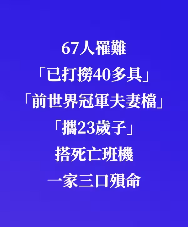 67人罹難「已打撈40多具」!「前世界冠軍夫妻檔」 攜23歲子搭死亡班機, 一家三口殞命!