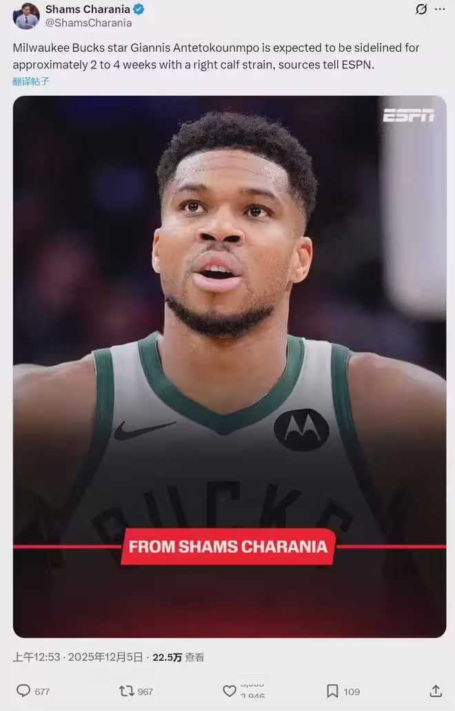 12月5日凌晨1點,據NBA名記Shams報道,字母哥右小腿拉傷,預計將休戰2-4周。在雄鹿和活塞的比賽中,開場3分鐘字母哥因傷退賽。中外球迷紛紛表示:雄鹿這是對字母哥進行交易保護,害怕他在交易之前再次受傷。