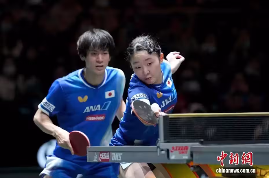 12月6日,四川成都,日本隊隊員張本美和(右)與戶上隼輔在混合雙打比賽中。當日,2025年成都國際乒聯混合團體世界盃第二階段比賽中,中國隊以8:5戰勝日本隊。