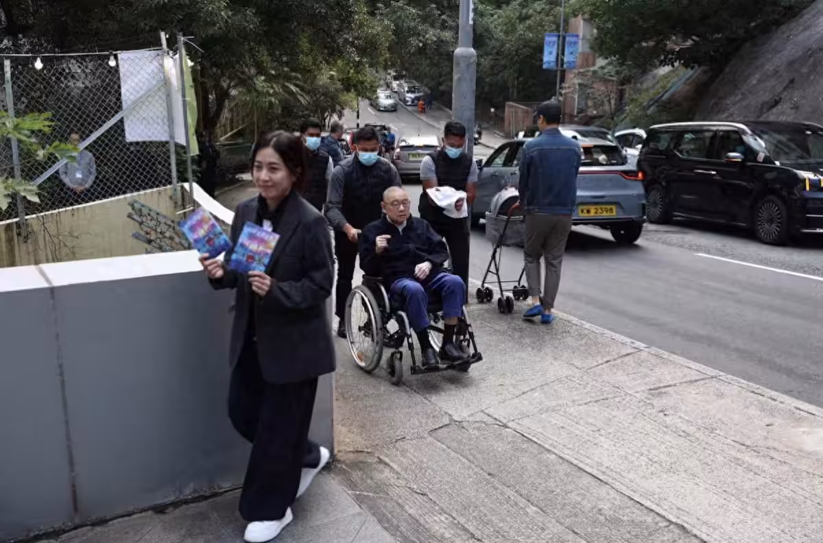 74歲劉鑾雄坐輪椅現身,需甘比攙扶起身,保鏢助理共五人相伴在旁